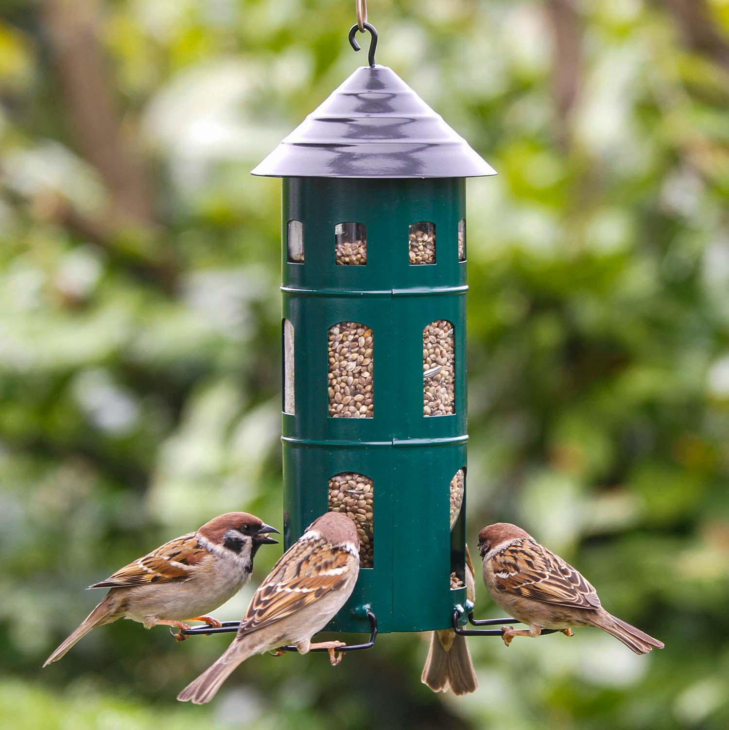 Hängender, grüner Vogelfutterspender im klassischen Schwedendesign, der besonders für Wildvogelfutter mit Sämereien geeignet ist.
