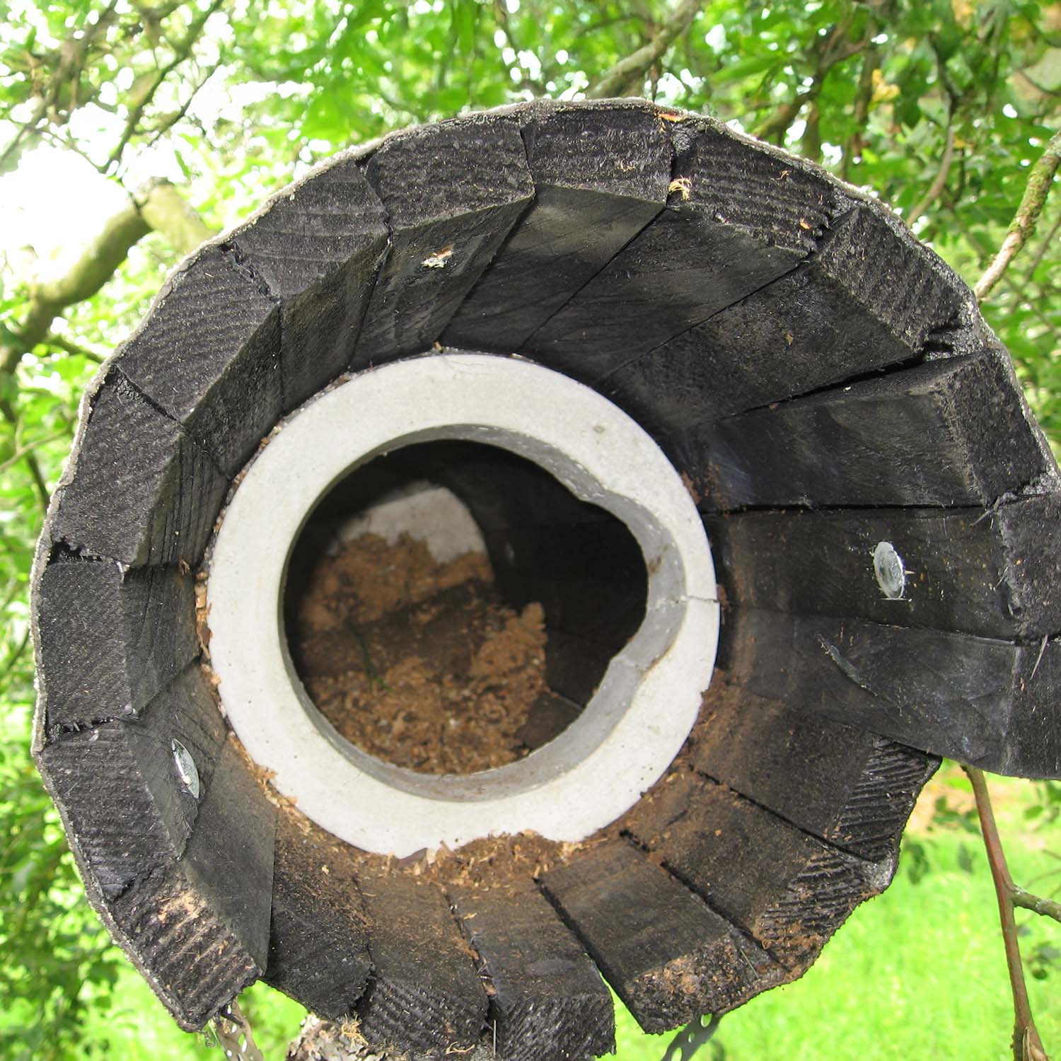 Material: Alle Röhren sind mit einer Reinigungs- und Kontrollöffnung versehen. Die Röhren bestehen aus einem Holz- bzw. Schwegler-Holzbeton-Ring welcher mit Holzleisten und mit besandeter und armierter Dachpappe ummantelt ist.
