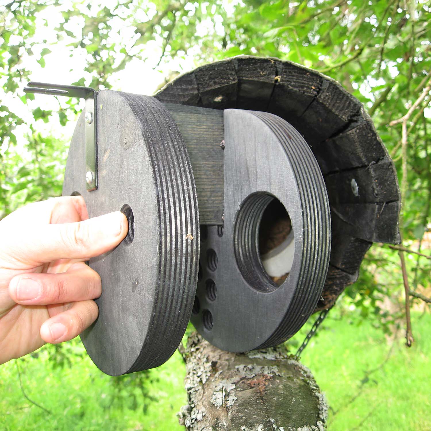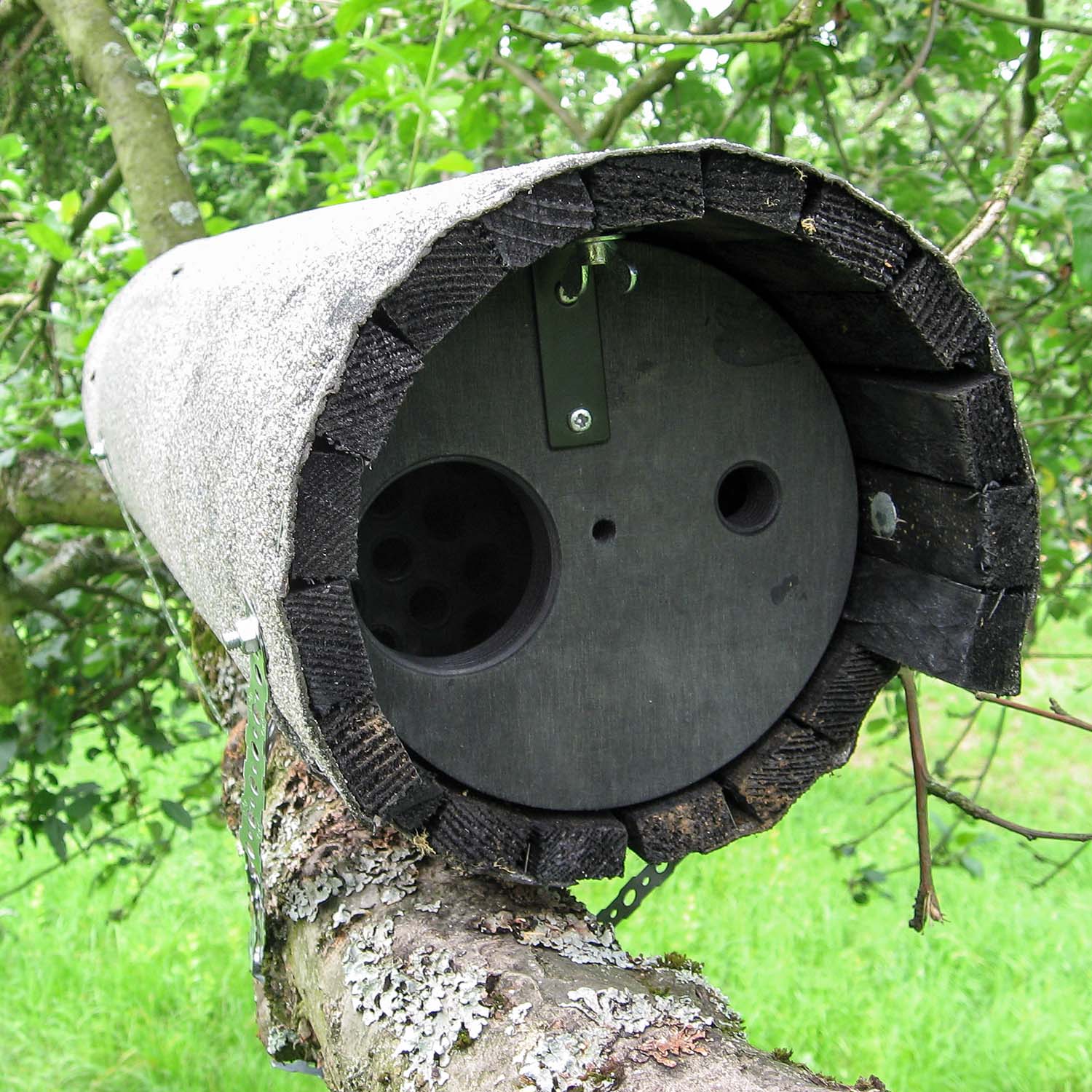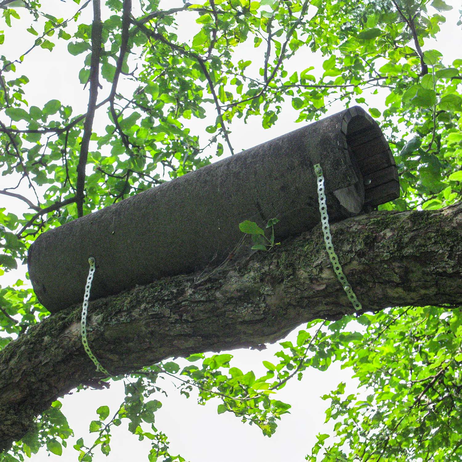 Schwegler Naturschutzprodukte. Herausragende Kombination von einfachem Zugang, Belüftung und Räuberschutz. Lieferung inkl. Lochbändern zur Montage an waagerechten Ästen.