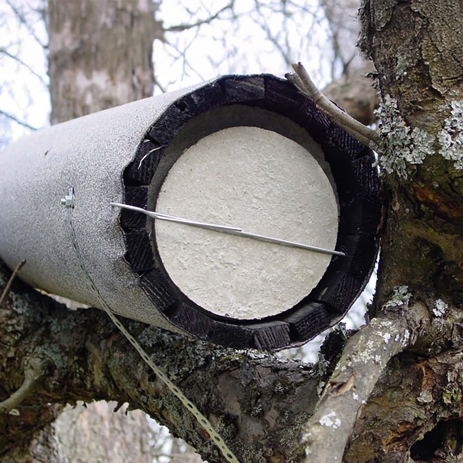 Montage: Die Röhren werden auf einen waagrechten Obstbaumast oder in Kopfweiden mit dem Einflugloch zum Baumstamm gelegt. Dies erschwert Spaziergängern o.ä. die Höhle zu öffnen. Gleichzeitig dient diese Aufhängeweise auch dem besseren Anflug der Steinkäuze. Die Röhre Typ Nr. 22 eignet sich zusätzlich zur Montage an Bäumen ohne waagrechte Astteile.