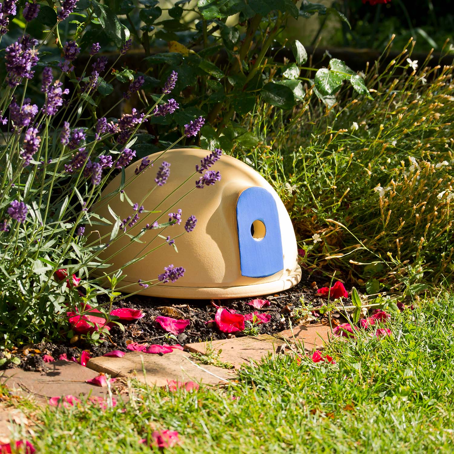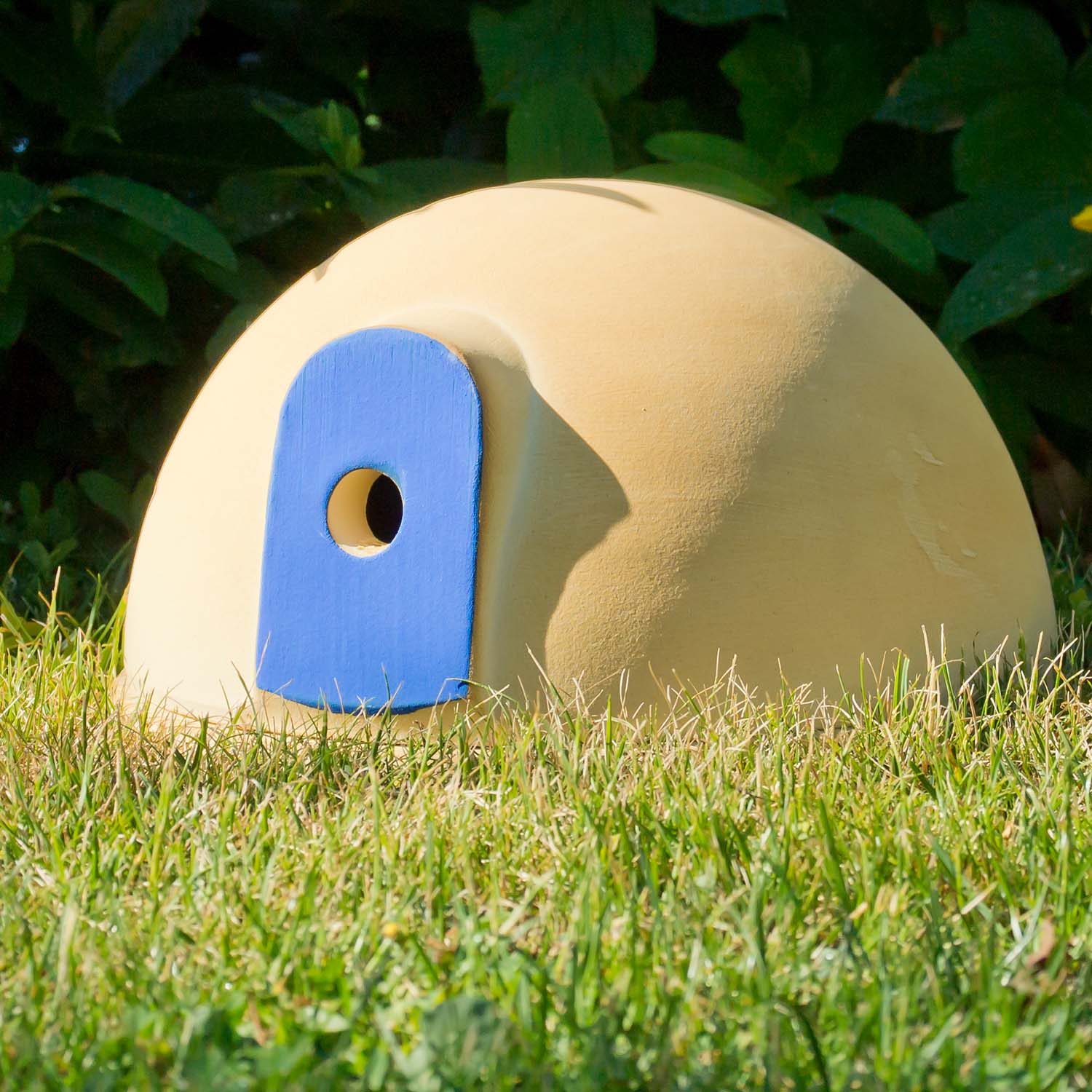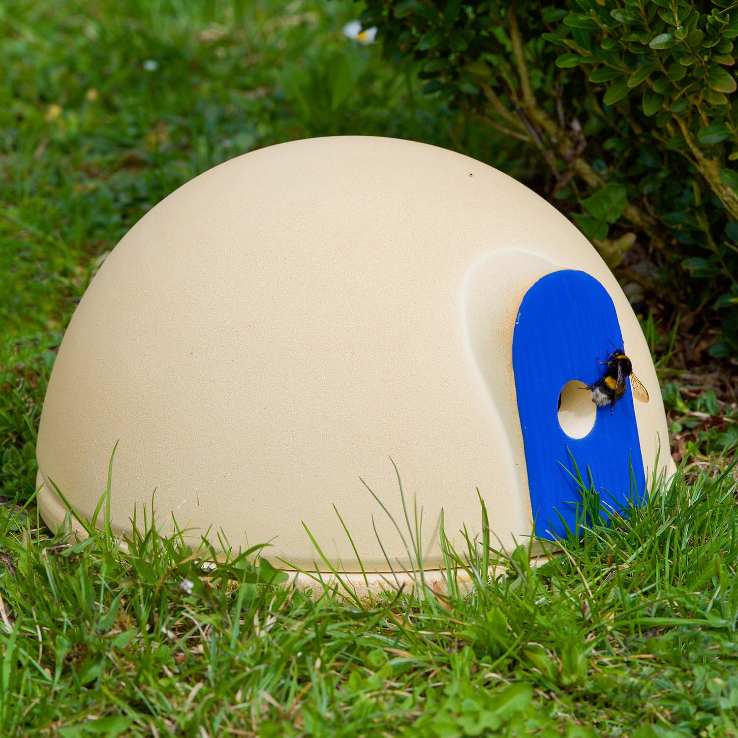 Das Hummelhaus besteht aus einer isolierenden Bodenplatte und einer Kuppel mit einer Keramikröhre hinter dem Eingang. In das Innere wird Kapokwolle als Nistmaterial gelegt, die im Lieferumfang in einer Menge enthalten ist, die für fünf Jahre ausreicht. Der Eingang wurde blau bemalt, was zum einen die Hummeln anlockt und ihnen zum anderen ermöglicht, das Hummelhaus leichter wiederzufinden. Hier kann die Hummel im Frühjahr ein Hummelvolk gründen und ab Herbst eine Königin überwintern.