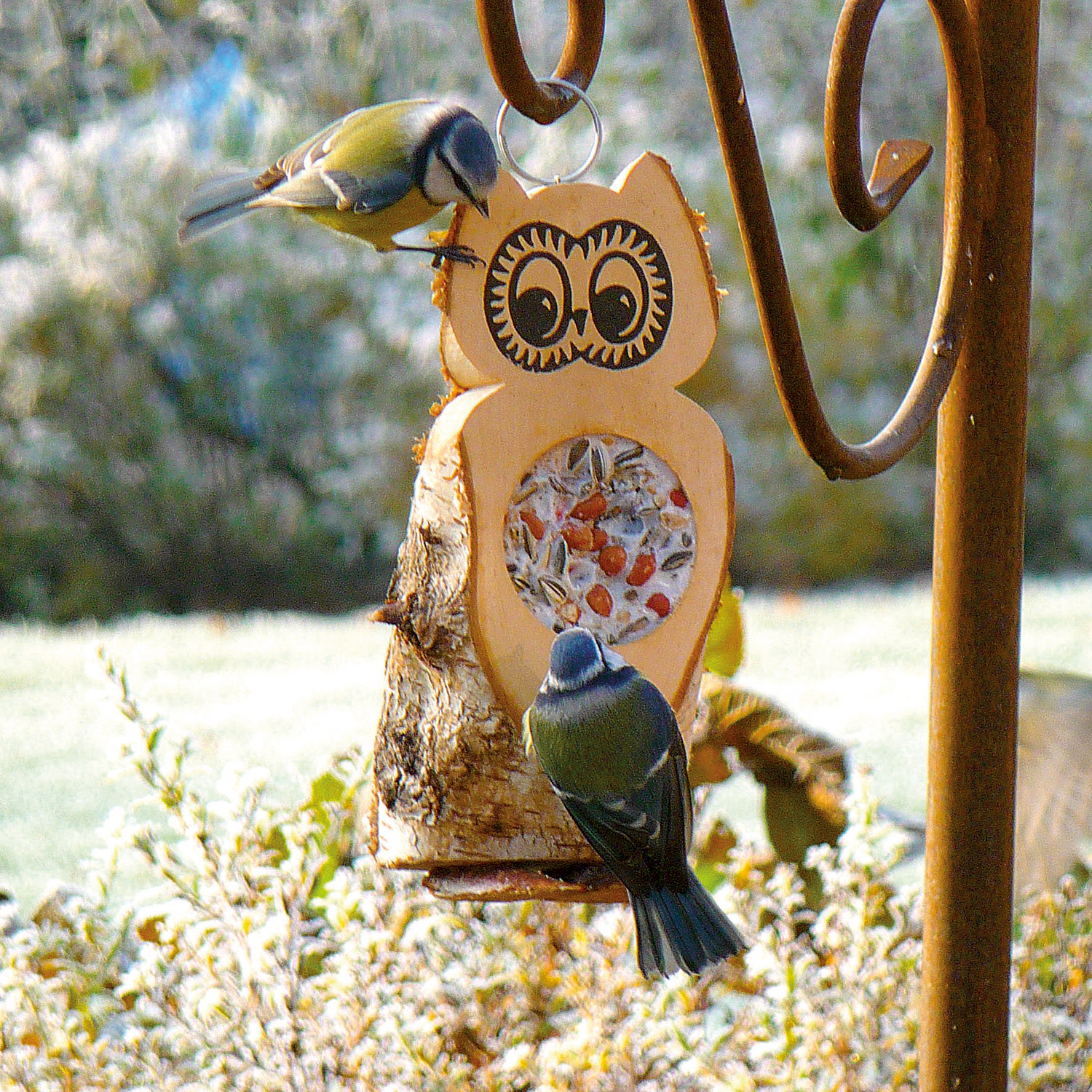 Die Futtereule ist eine aus Birkenholz hergestellte, nachfüllbare Winterfütterung für Vögel. Durch die Füllung der Futtereule mit Vogelfutter und Rindertalg werden sich Ihre Vögel bei dieser Winterfütterung über stets sauberes und trockenes Vogelfutter freuen. Die Futtereulen sind Unikate. Jedes Stück ist in Handarbeit gefertigt. Wie man die Eule wieder auffüllt siehe unter "Futtereule".